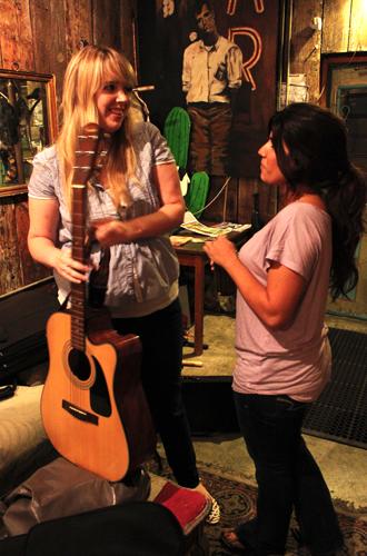 Loyola senior Kerry Hayes and Cristina Perez chat before perfoming at the Neutral Ground coffee shop on Saturday. (SANTIAGO CIACIDO/Contributing Photographer)